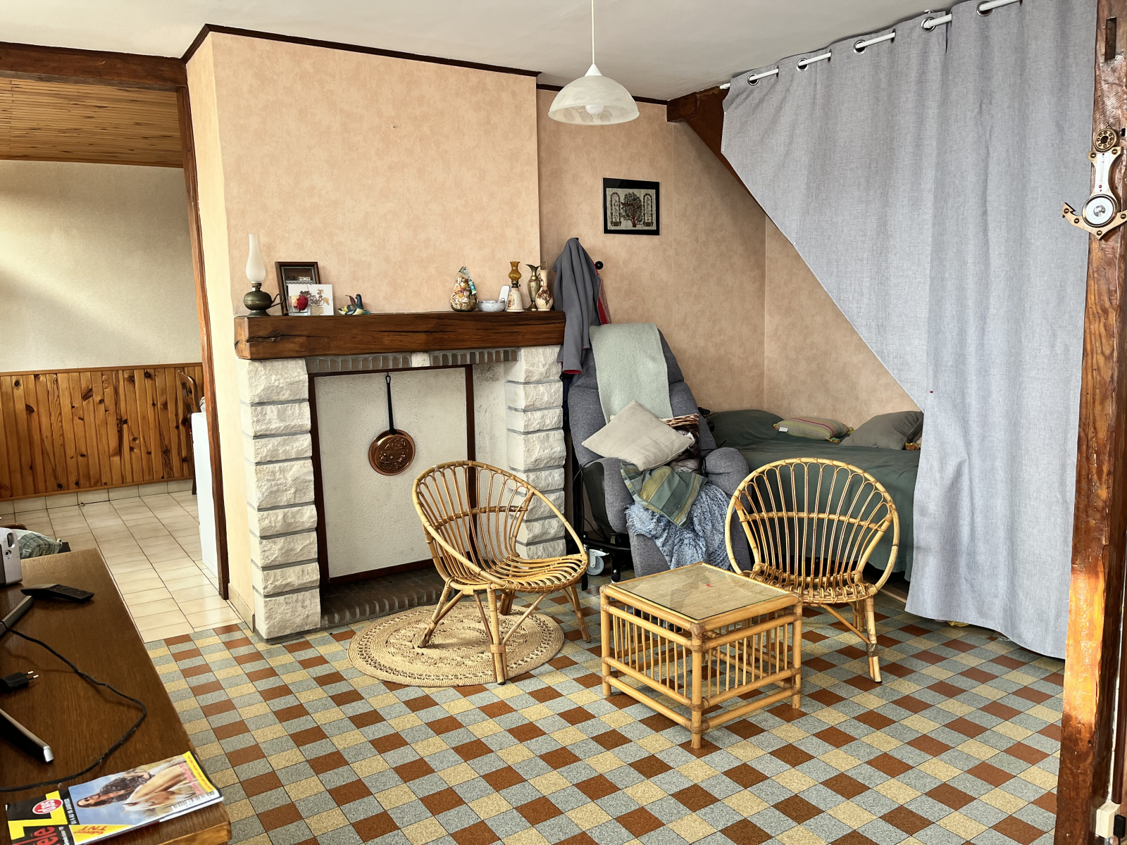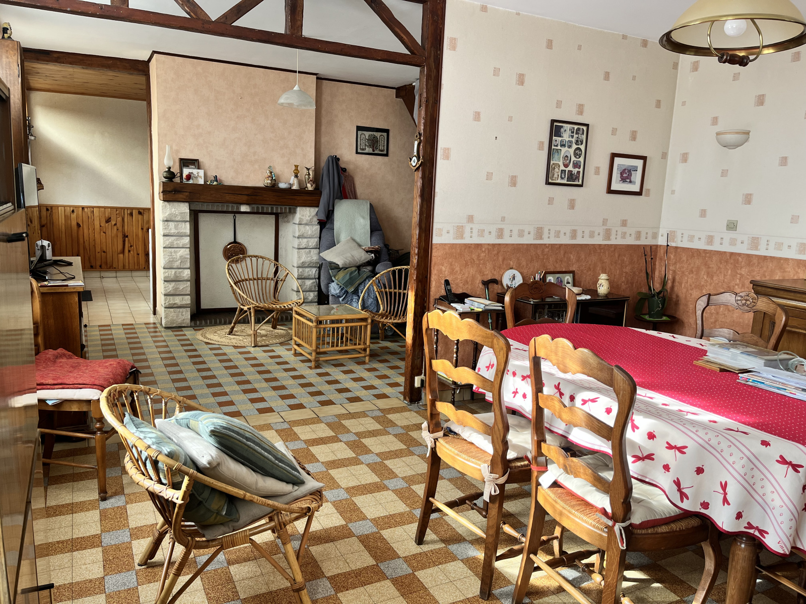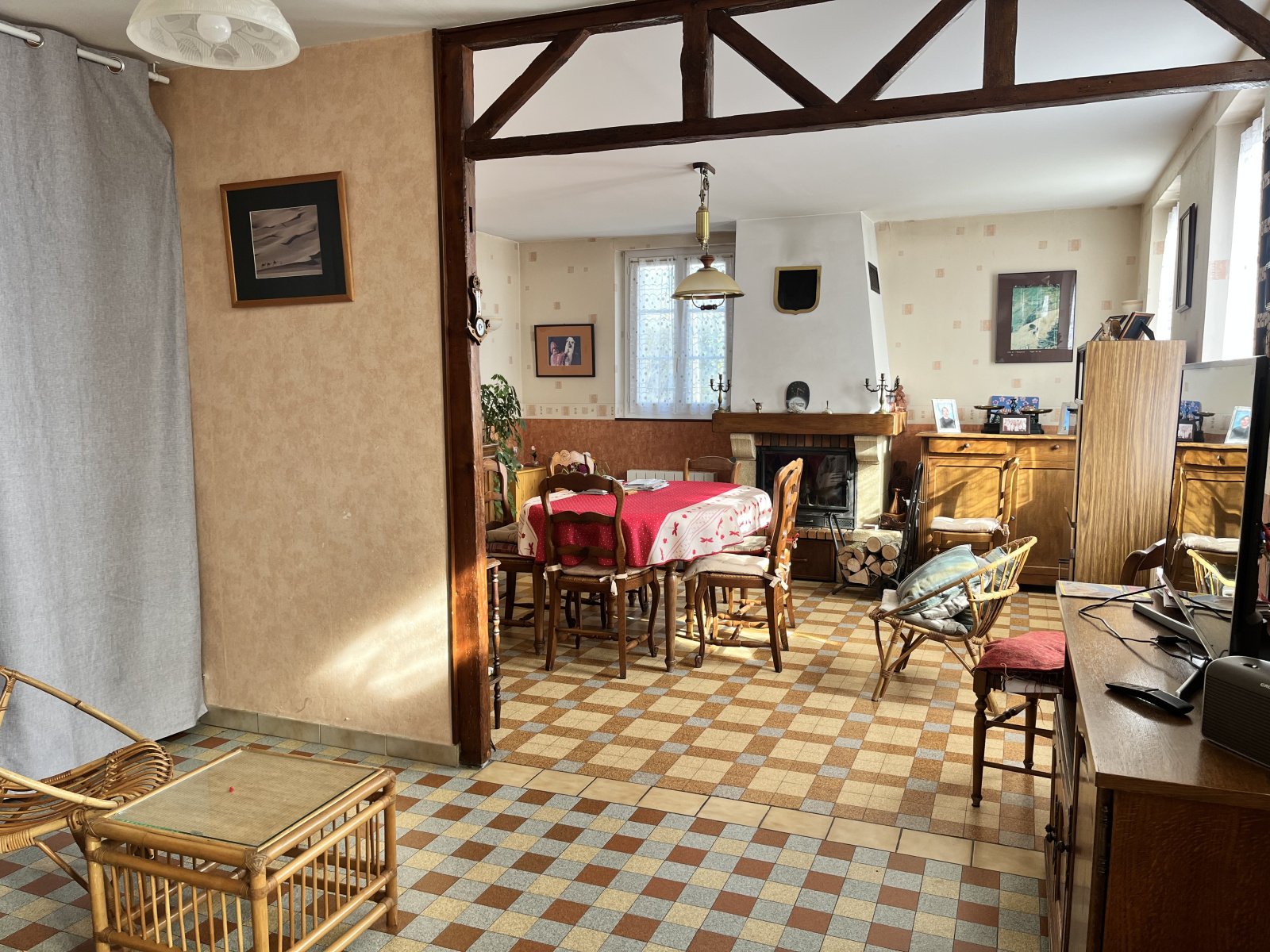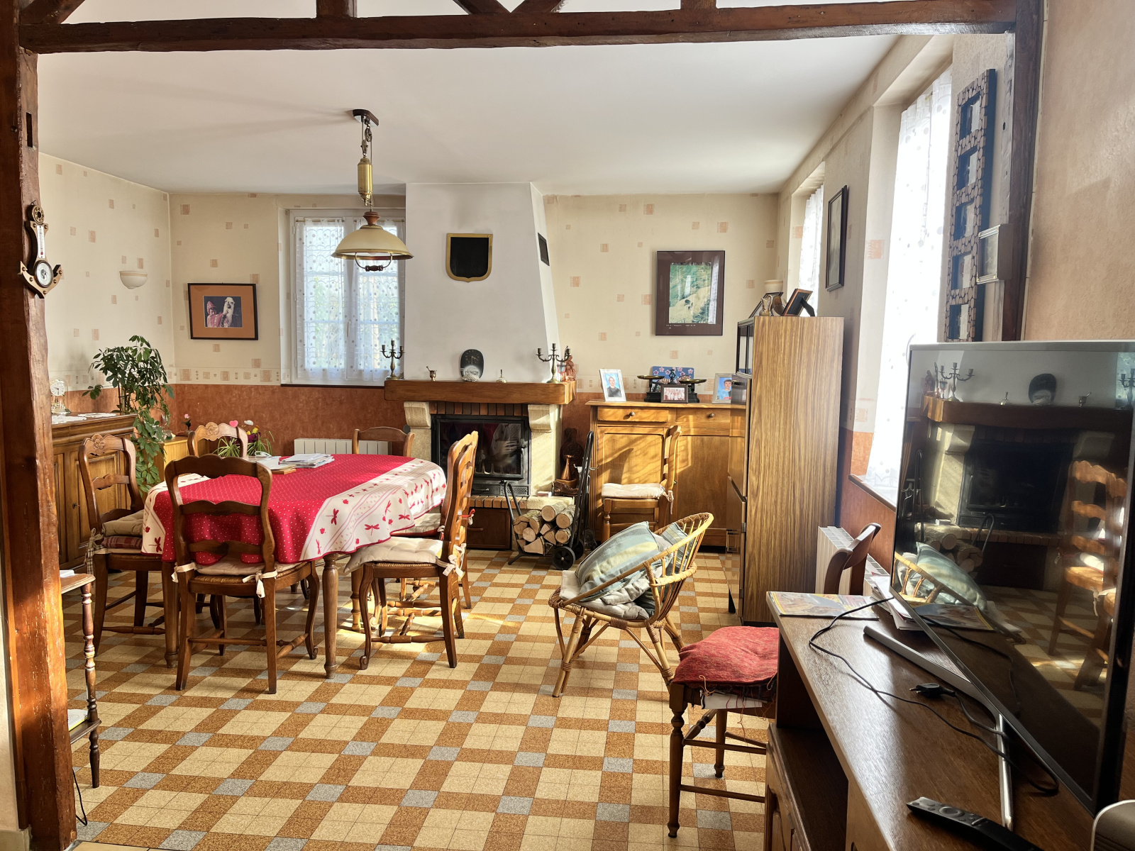 Rez de chaussée : Véranda, cuisine, dégagement desservant le séjour-salon avec cheminée insert, salle d'eau, wc.