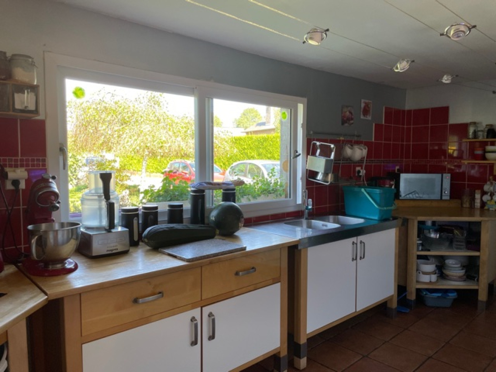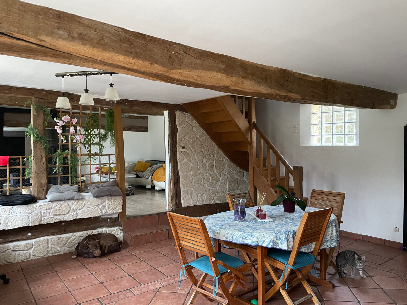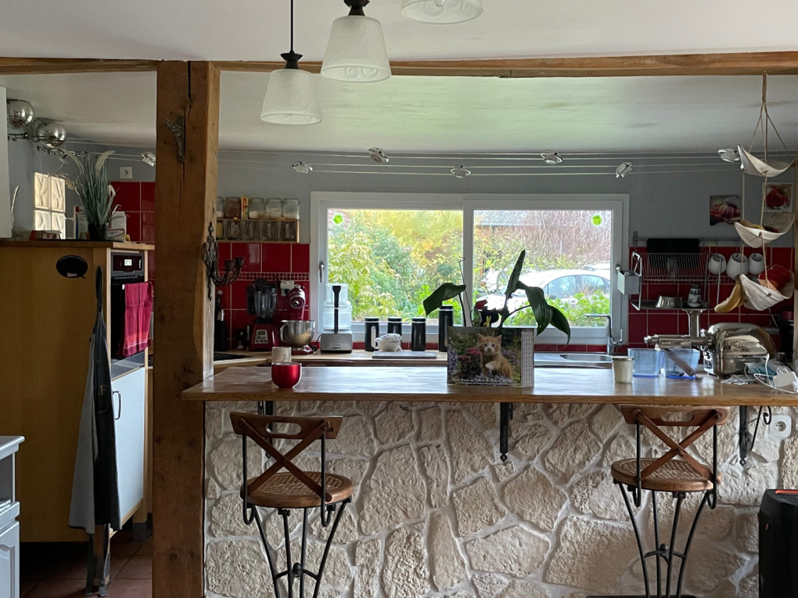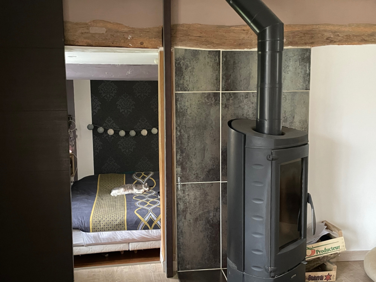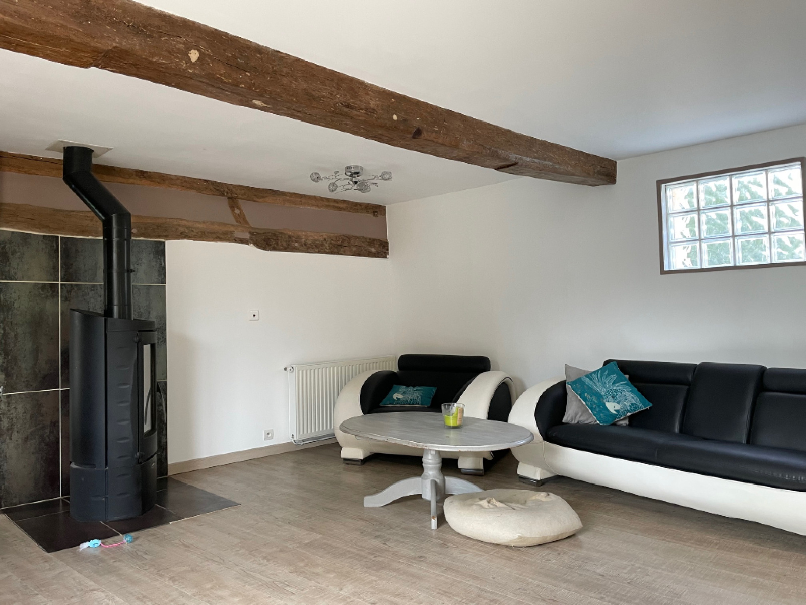 Rdc: Entrée sur séjour de 30m² , cuisine ouverte aménagée et équipée, salon avec poele bois, 1 jolie chambre avec salle de bains, lingerie, wc.