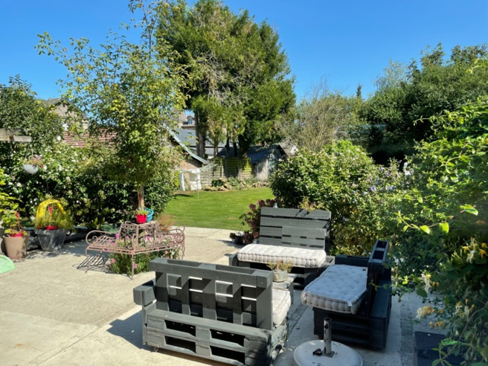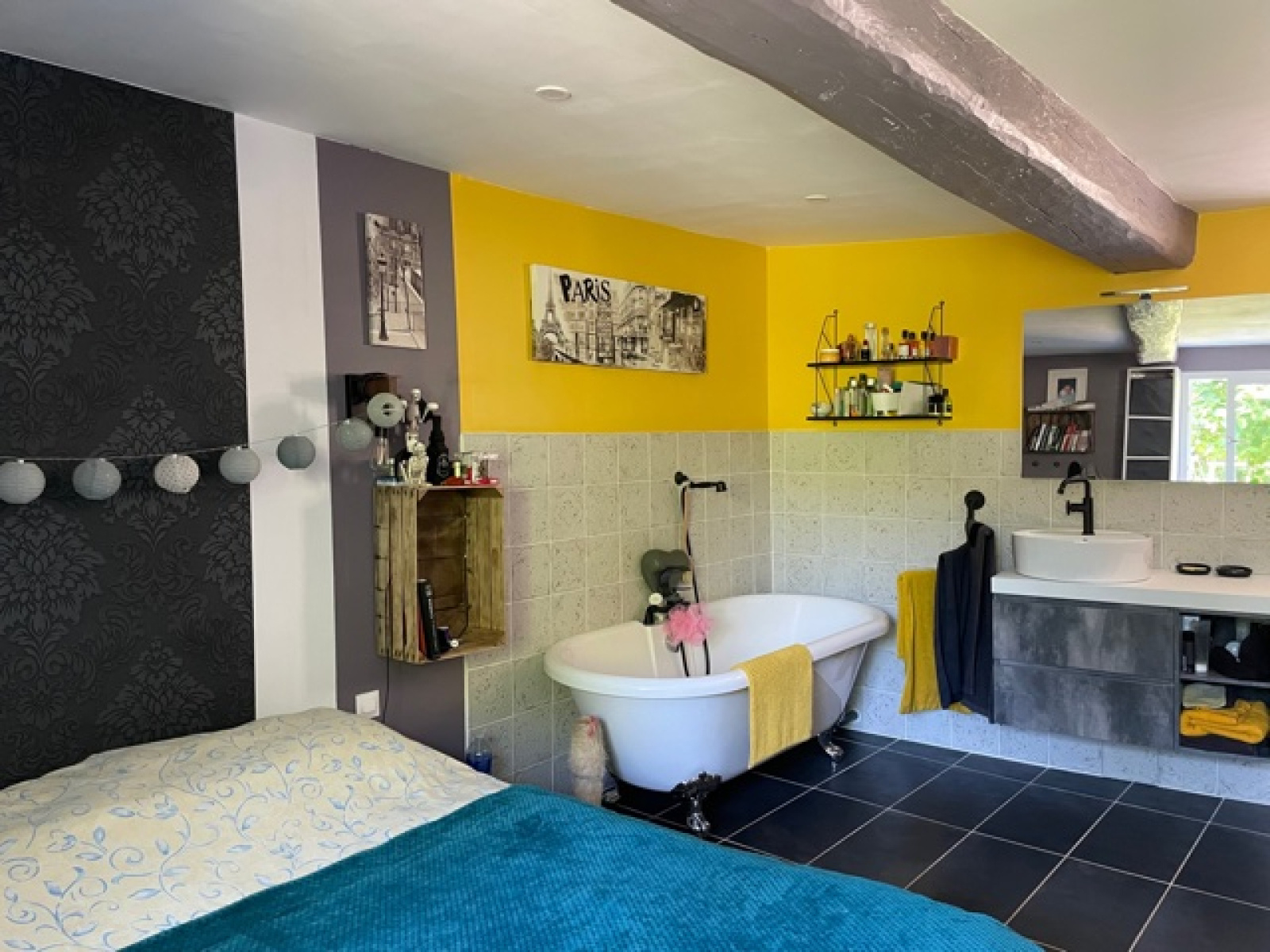 A l'étage: Vaste pièce palière (possibilité chambre ou salon d'étage), 2 chambres, salle d'eau, wc. Double charreterie, terrasse, petite maison en entrée de jardin (possibilité studio).