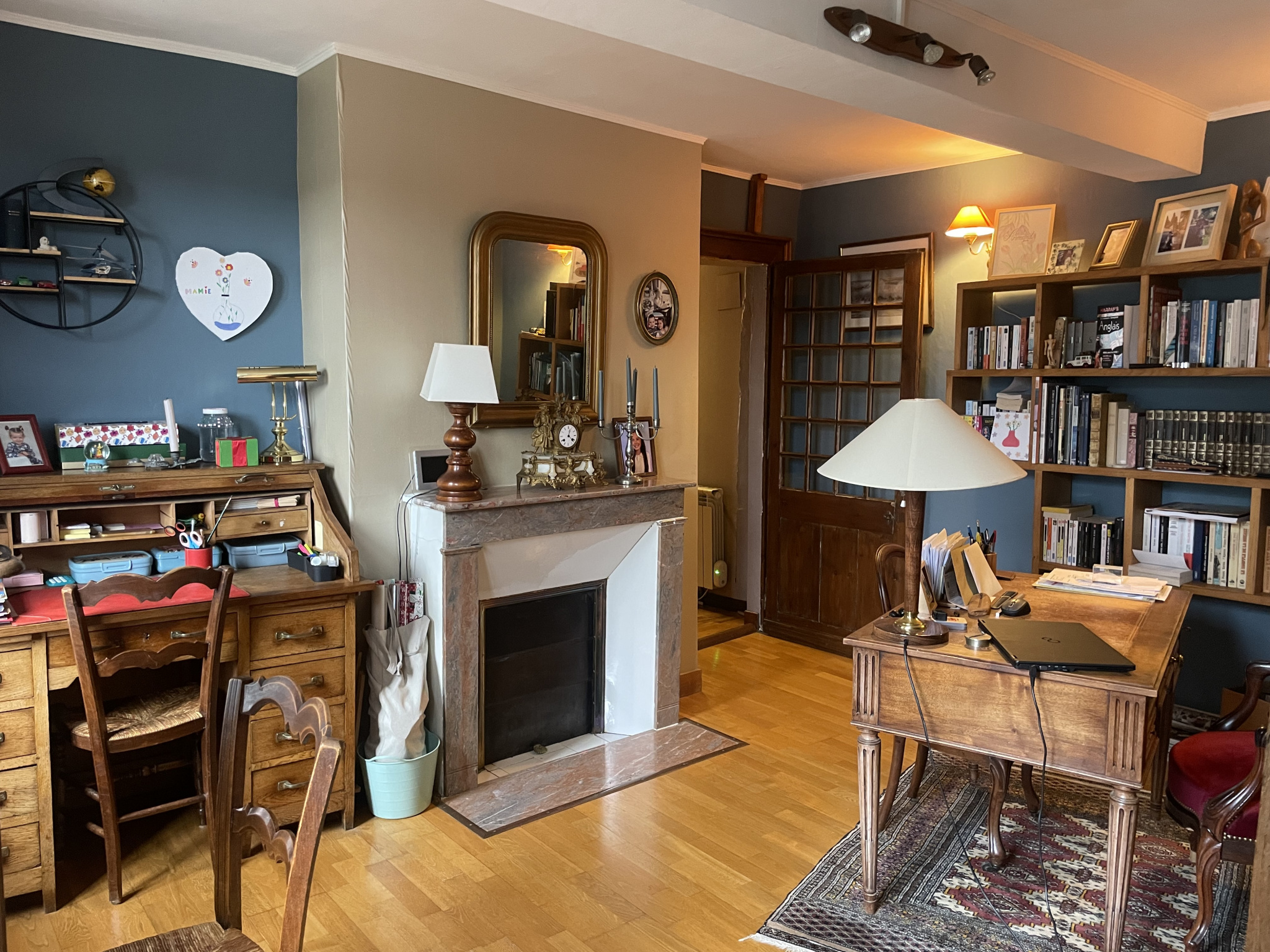 1er étage : Palier desservant cuisine aménagée et équipée ouverte sur séjour avec poêle à bois et accès petite terrasse, salle d’eau, wc avec lave-mains, salon, bureau avec cheminée puis 1 chambre avec cheminée, dressing avec wc.