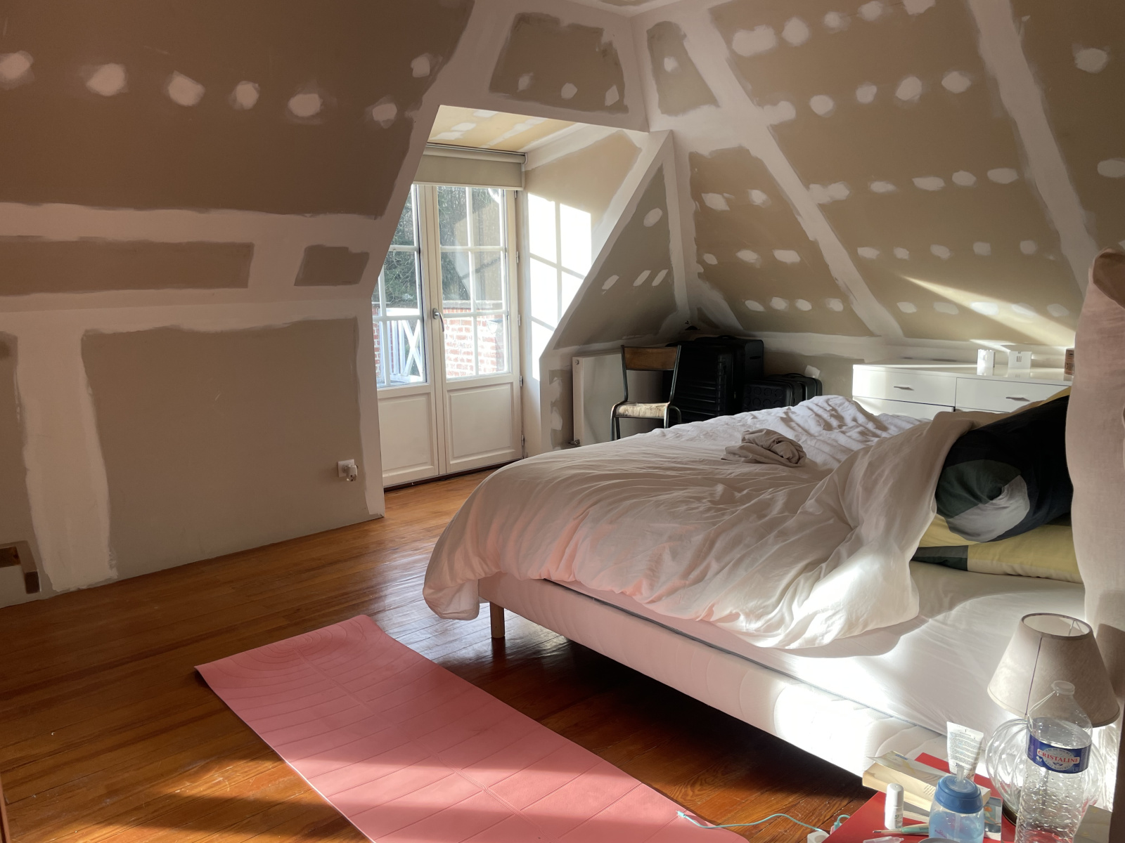 Etage: Palier desservant 2 chambres, 1 double chambre avec salle d'eau et wc ouvrant sur un toit terrasse, salle de bains avec wc.