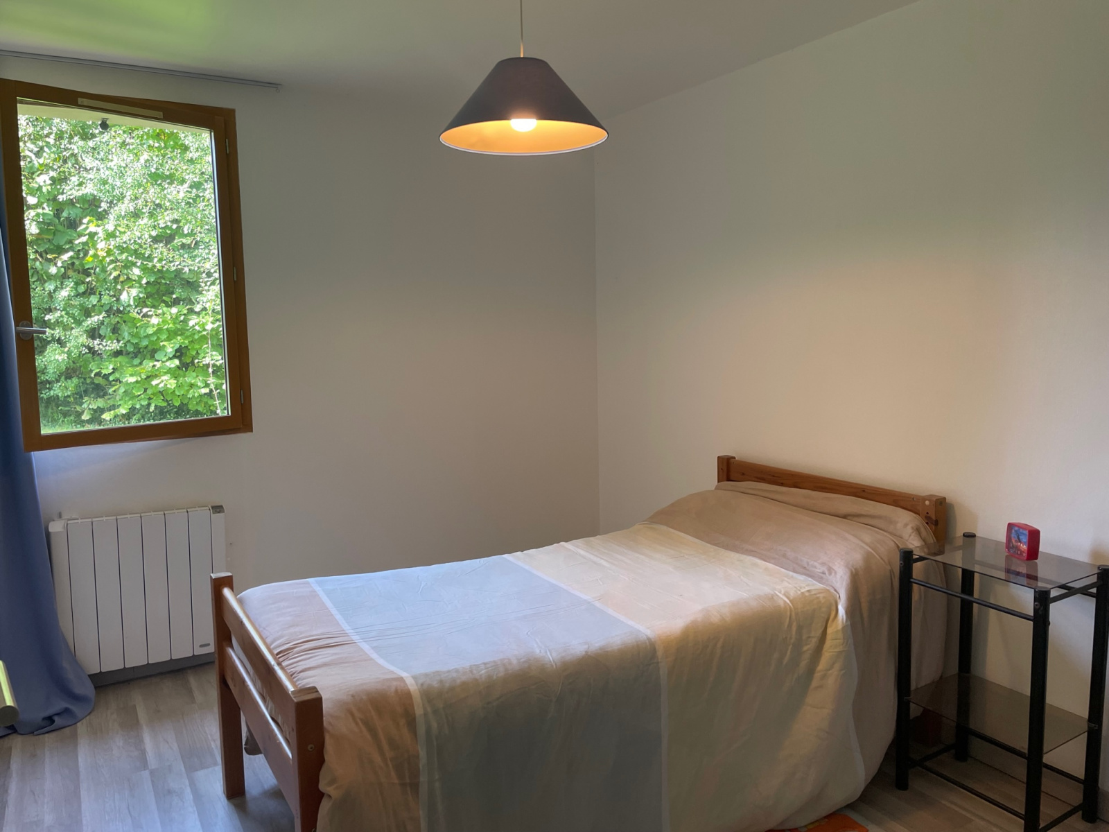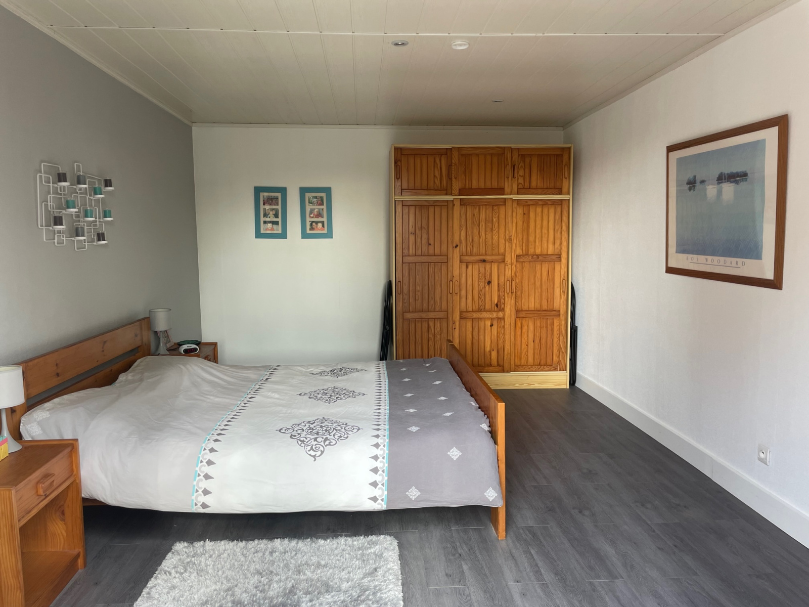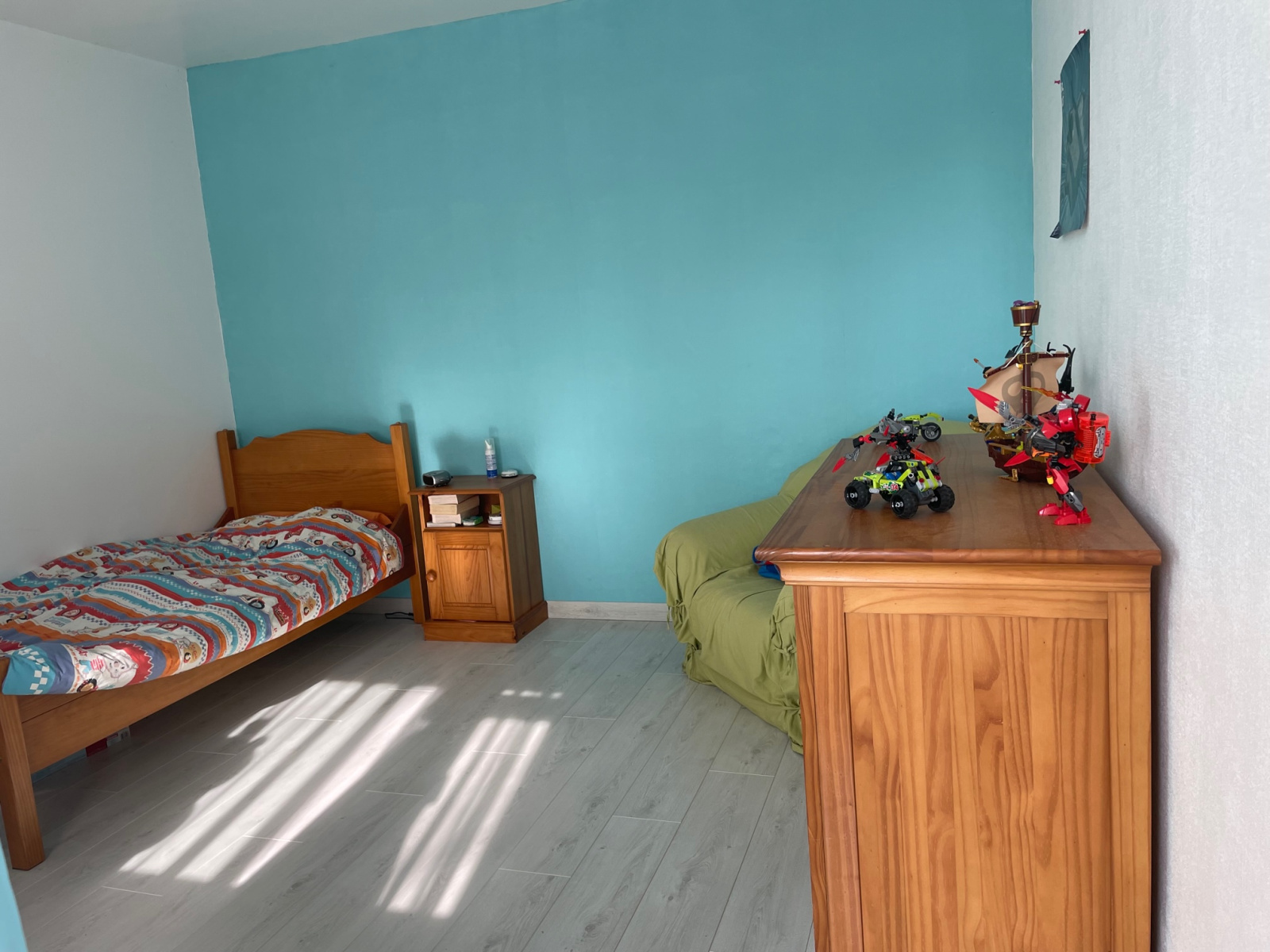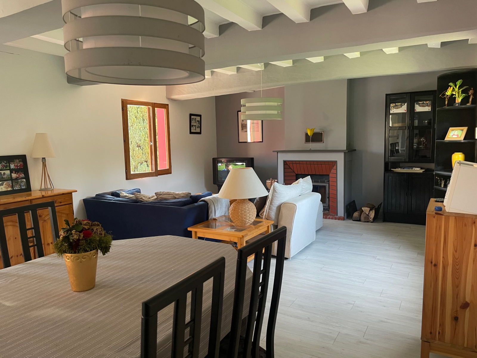 Entrée sur séjour-salon avec cheminée/insert, cuisine ouverte aménagée et équipée, couloir desservant 3 chambres, salle de bains avec douche, wc.