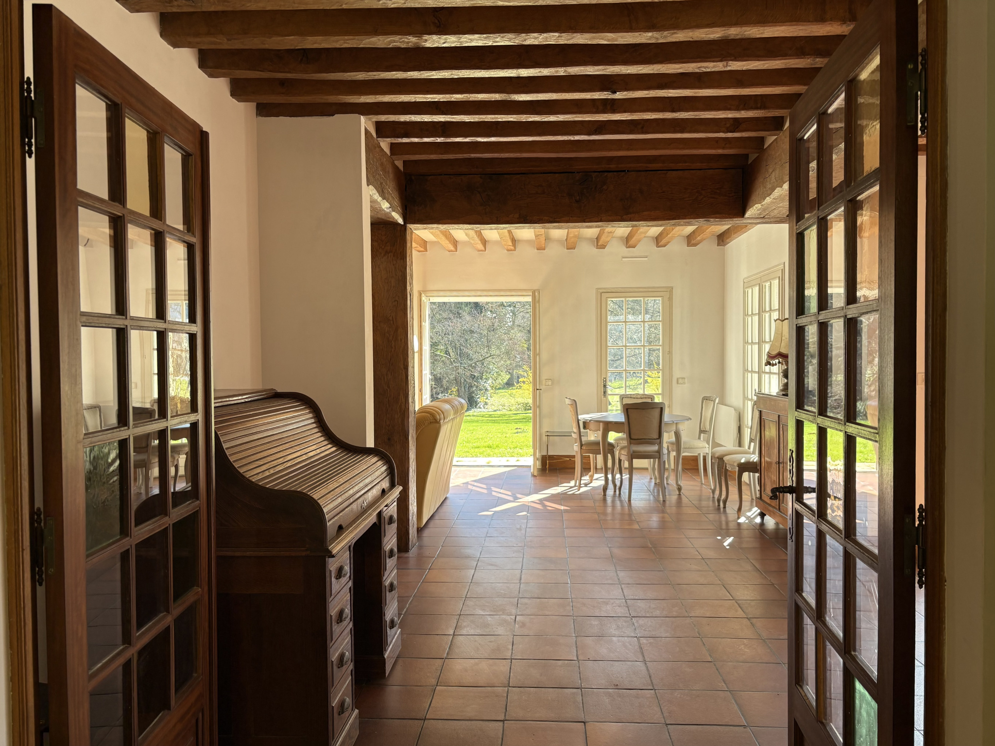 Rdc: Belle entrée, vaste séjour-salon avec cheminée ouvrant sur la terrasse plein sud, cuisine A&E, arrière cuisine, 1 belle chambre avec sdb et douche et wc, bureau.