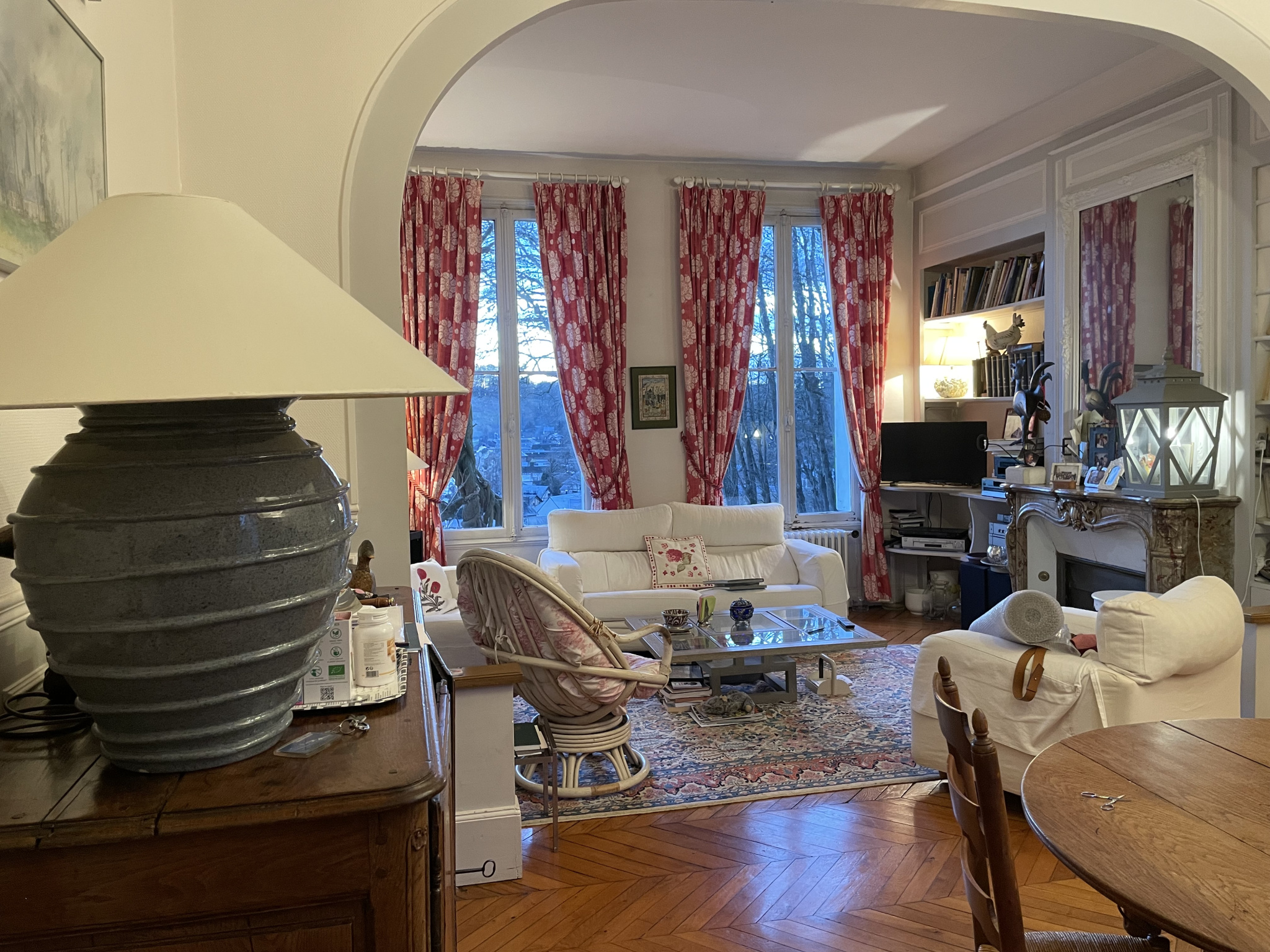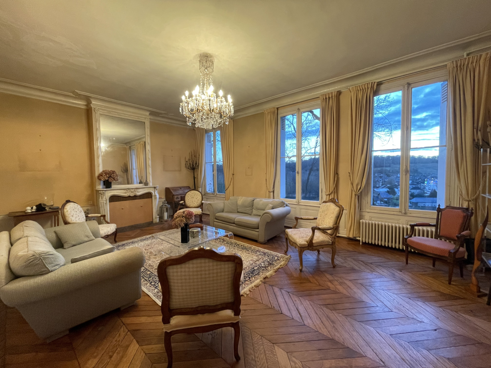 Rez de chaussée : Entrée traversante, séjour-salon parqueté avec cheminée (non fonctionnelle), double salon parqueté avec cheminée, cuisine aménagée et équipée, wc sur demi-niveau.