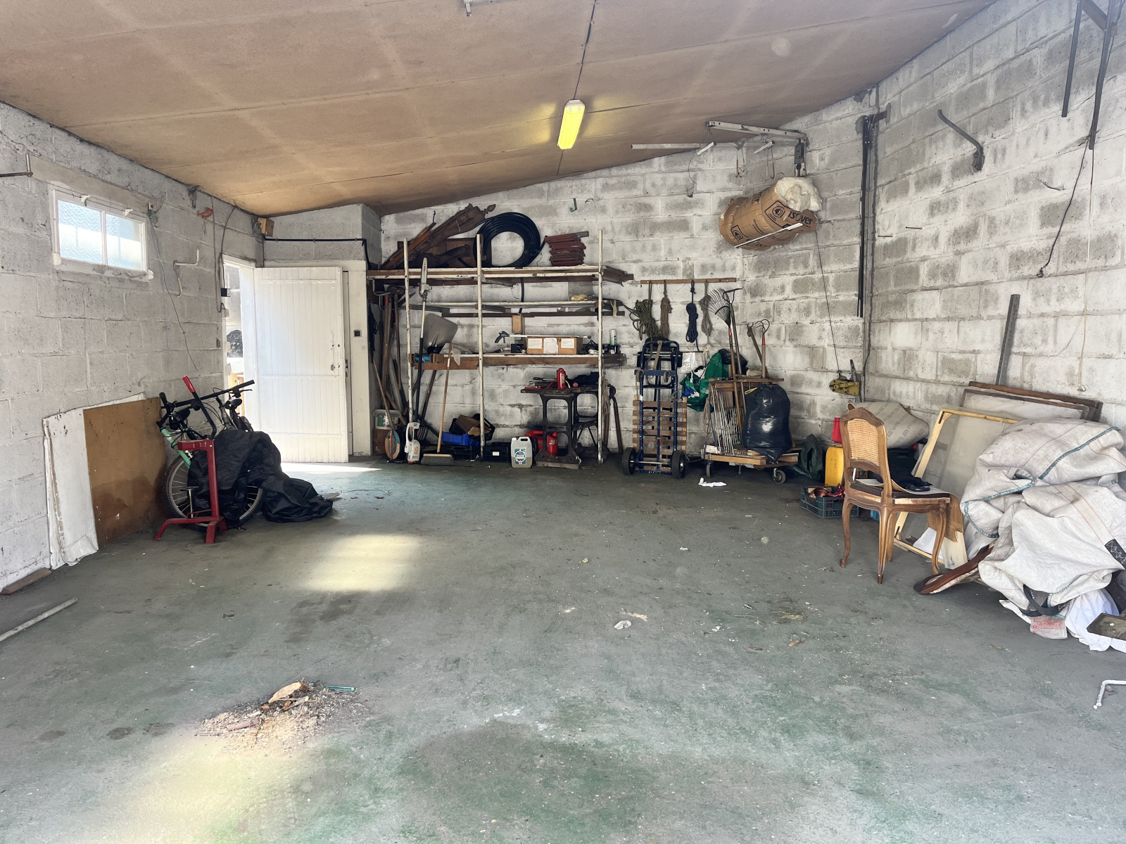 Sous sol à usage de chaufferie, atelier, petite cave à vin et cuisine. Grand garage de 45 m² environ avec wc.