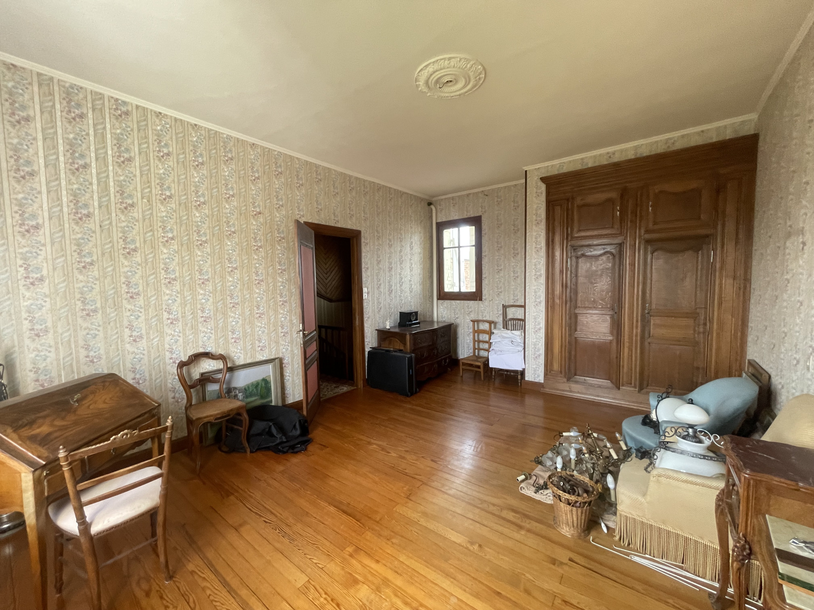 Etage: Couloir desservant 2 chambres parquetées, bureau, salle d'eau, wc. Grenier : 2 pièces amnéagées.