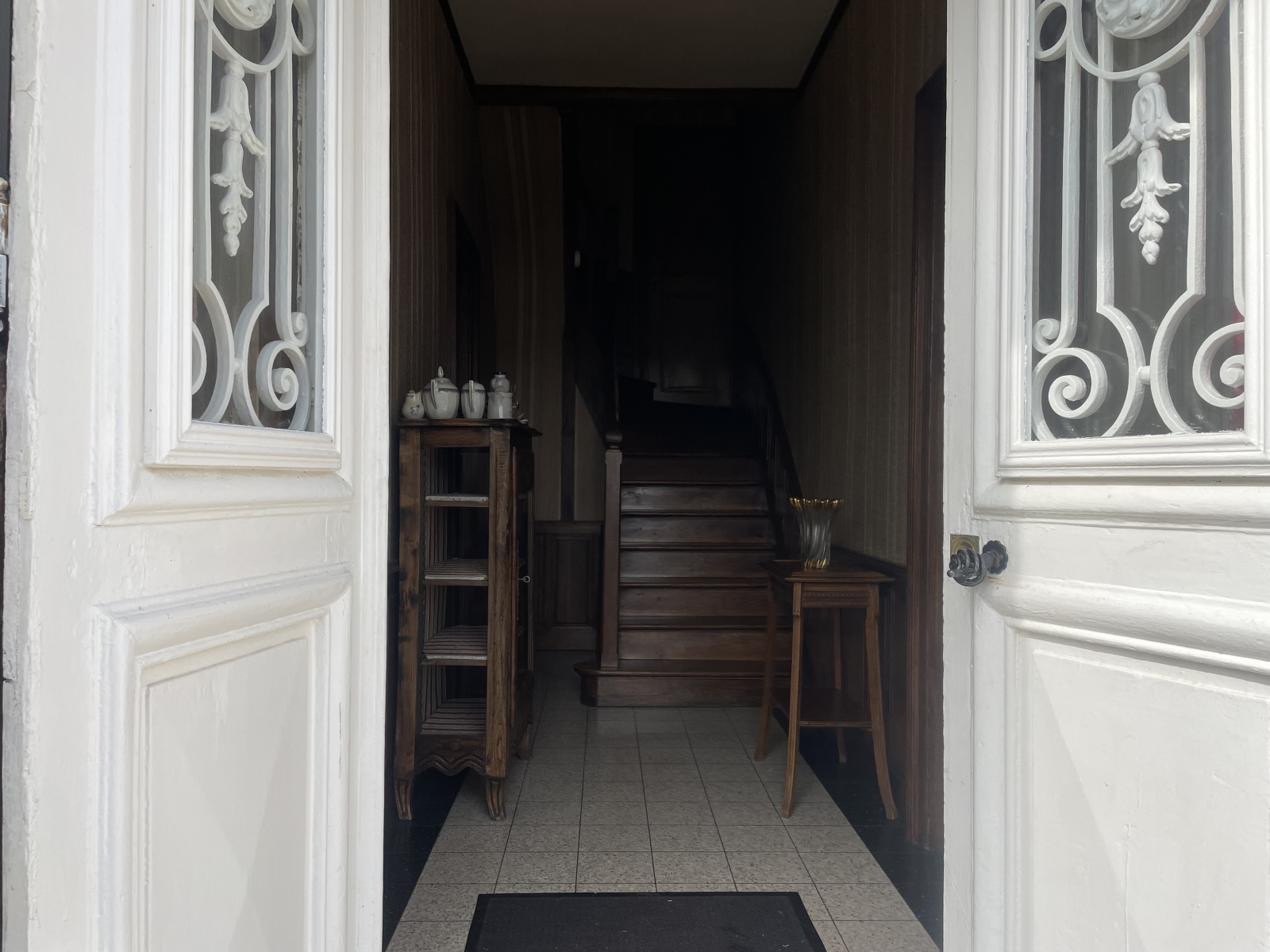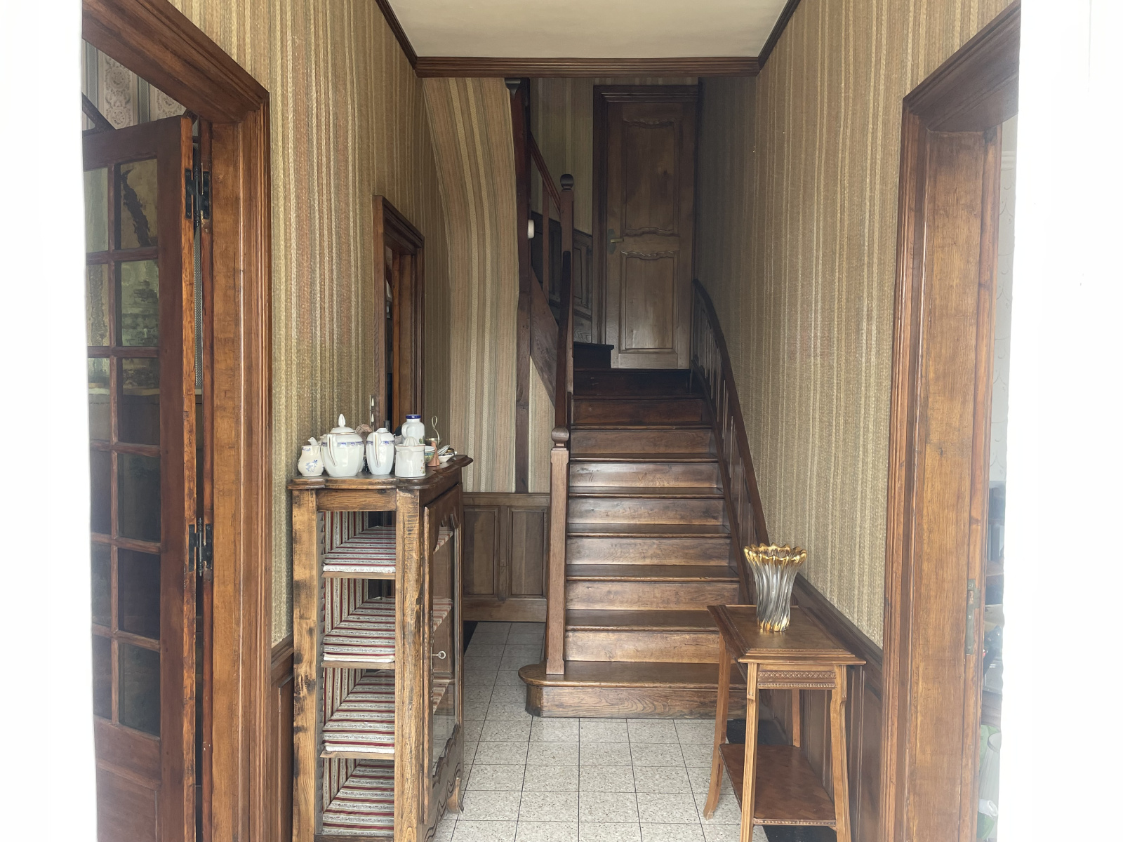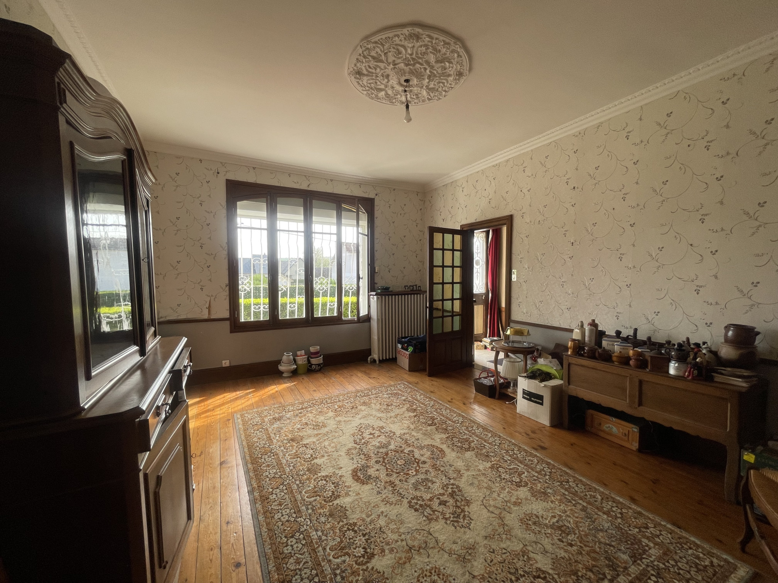 Rez de chaussée: Entrée, cuisine aménagée avec espace repas, salle à manger, salon parqueté.