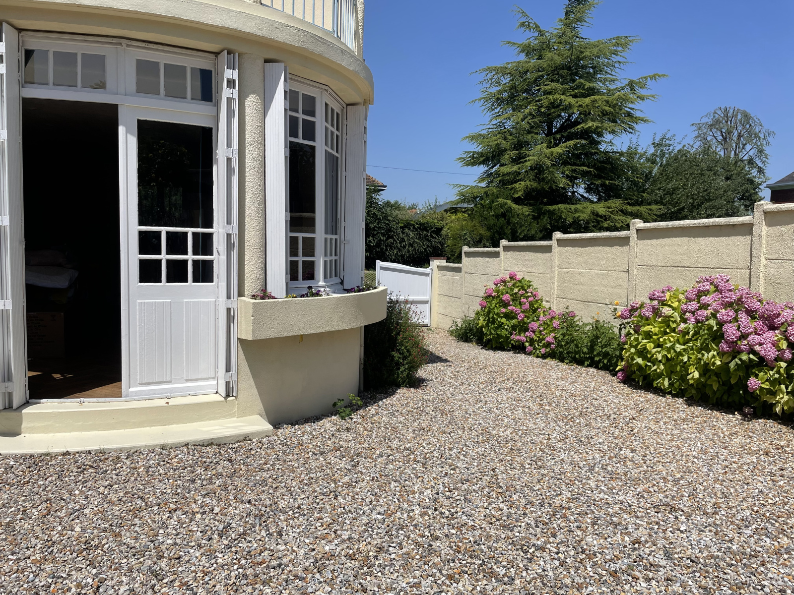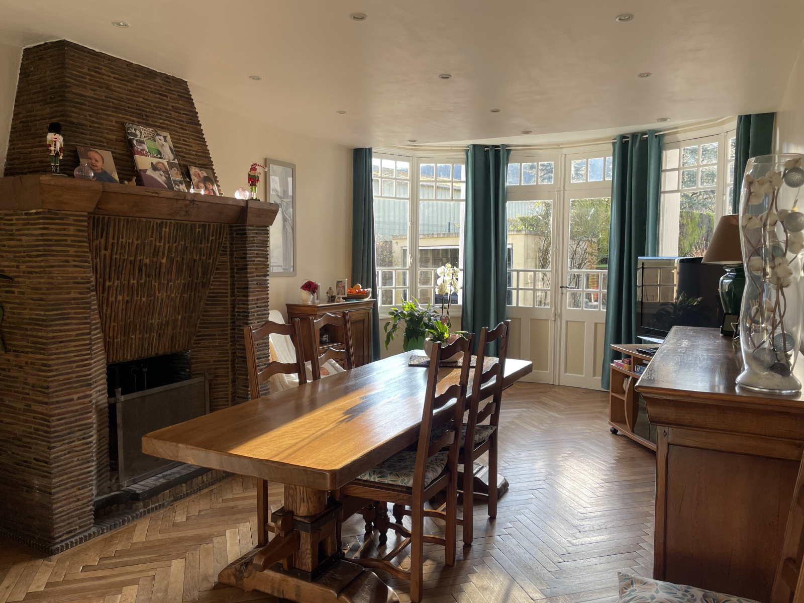 Rez de chaussée : Entrée, salon parqueté avec cheminée ouvrant sur le jardin, salle à manger, cuisine aménagée et équipée avec espace repas, wc avec lave mains et rangements, lingerie/cellier