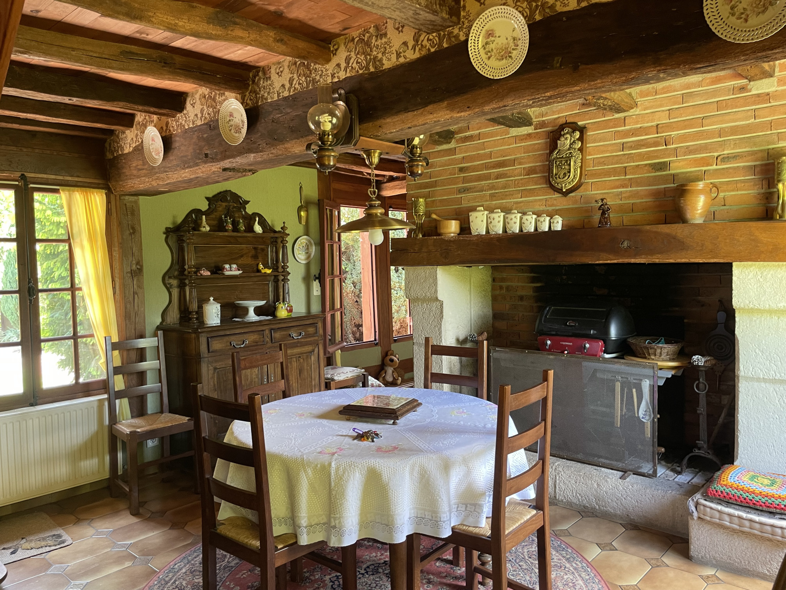 Rdc: Entrée sur séjour avec cheminée, salon avec cheminée, couloir desservant une petite cuisine ouvrant sur la terrasse, salle de bains, wc. Jolie cave sous partie.